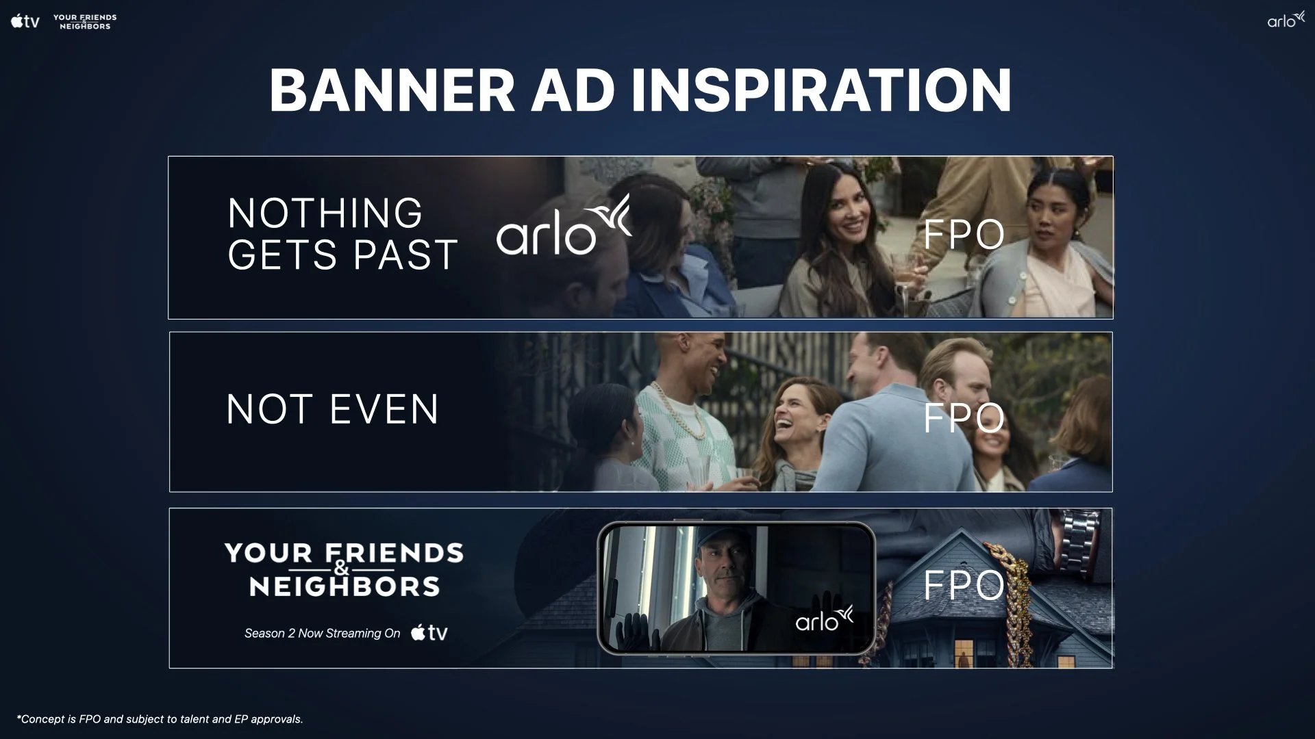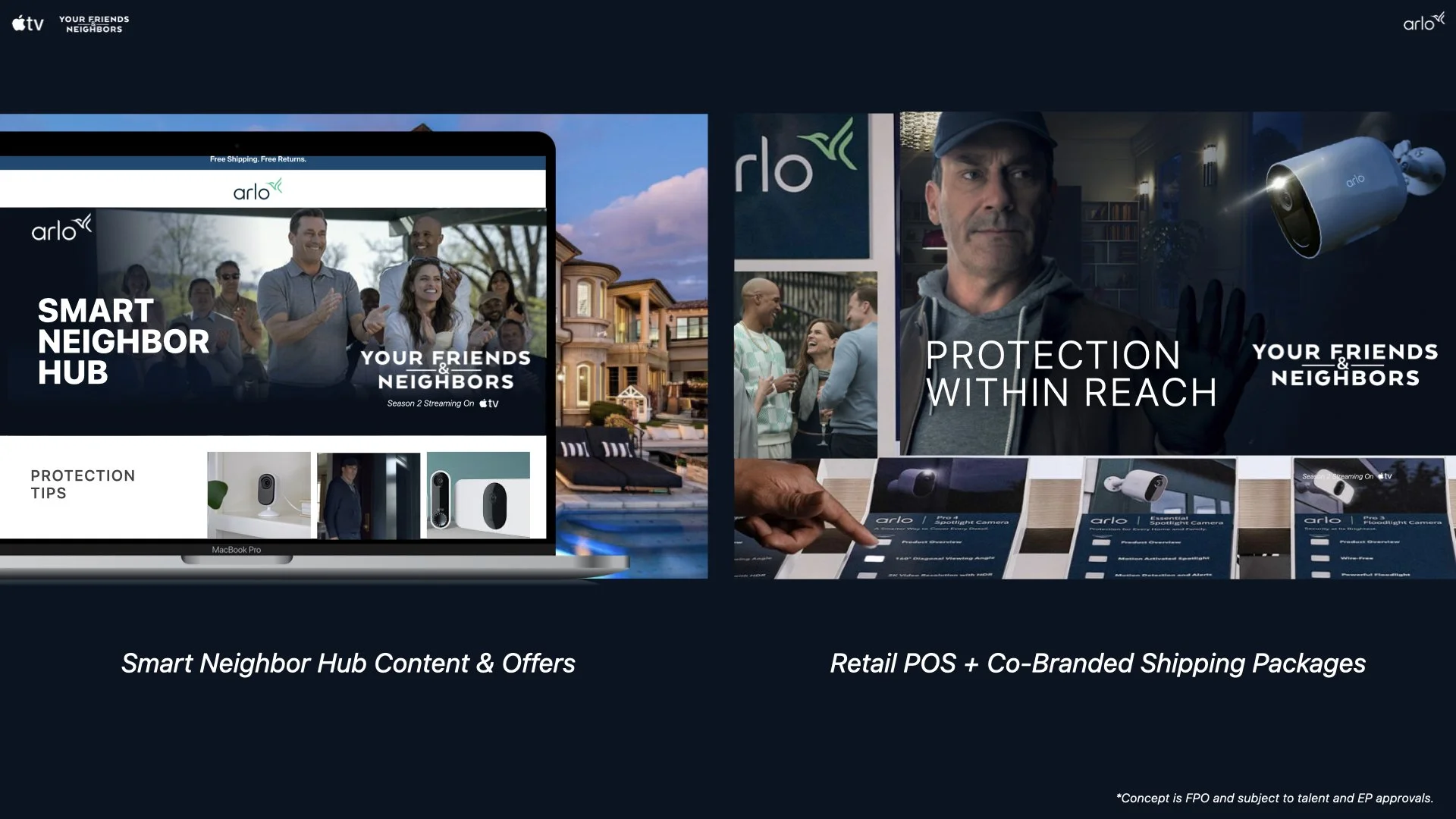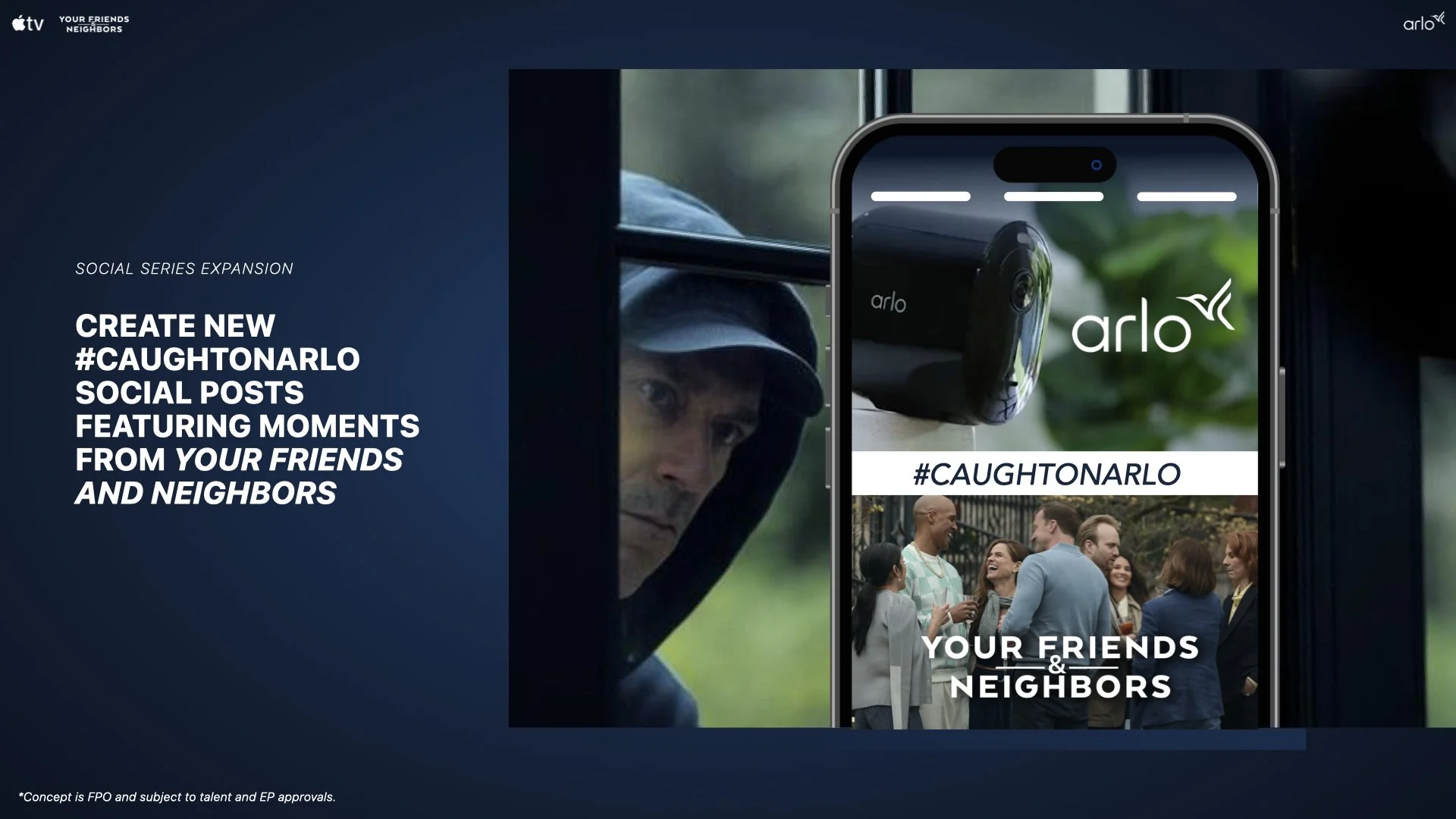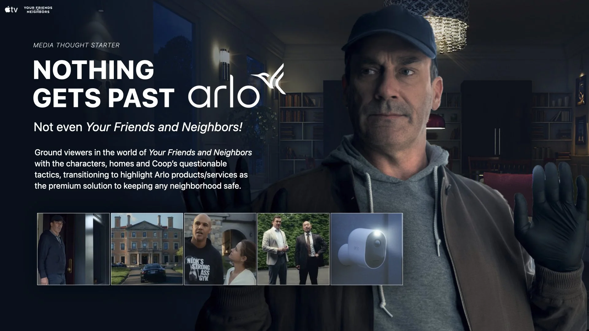 Creative direction and ideation for Apple TV’s Your Friends and Neighbors partnership with Arlo Home Security.